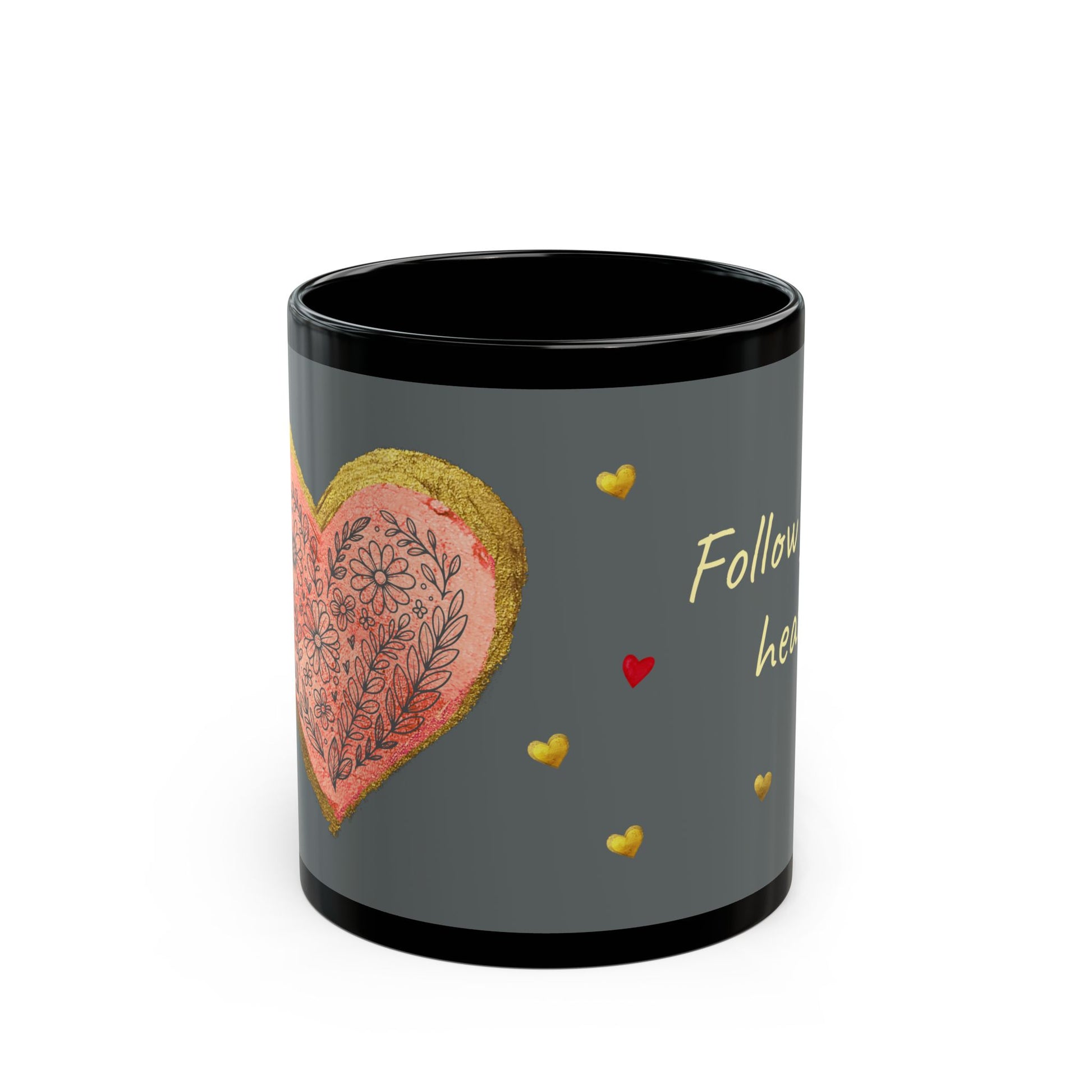By Canyon 17, creations that inspire the mind and soul, this radiant and soulful 11 oz gray on black ceramic mug features the beautiful Follow your heart print and design - perfect for your favorite coffee, tea, or hot chocolate. Made from 100% durable ceramic with a glossy finish, it’s microwave and dishwasher safe for everyday use. The high-quality sublimation printing brings this vibrant design to life, making it a thoughtful gift for anyone who appreciates beauty with their brew. It’s BPA and lead-free for safe sipping, with a comfortable C-shaped easy-grip handle for everyday use.