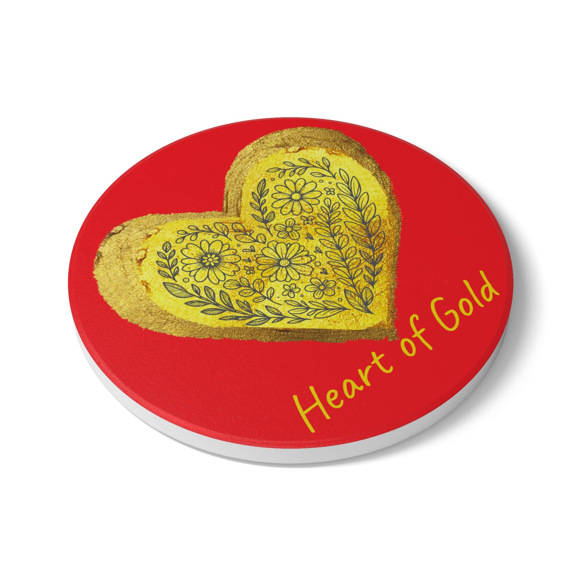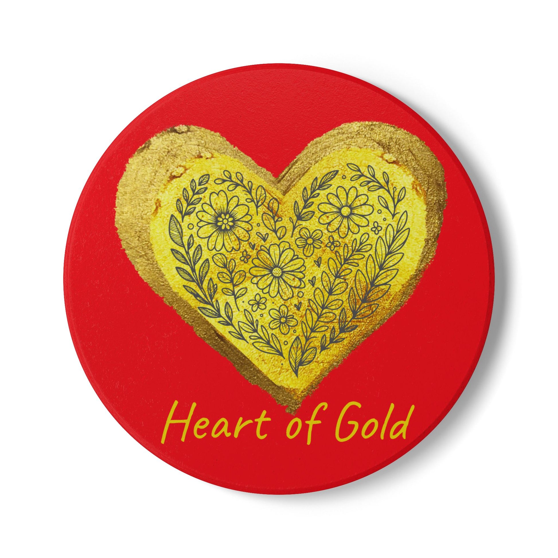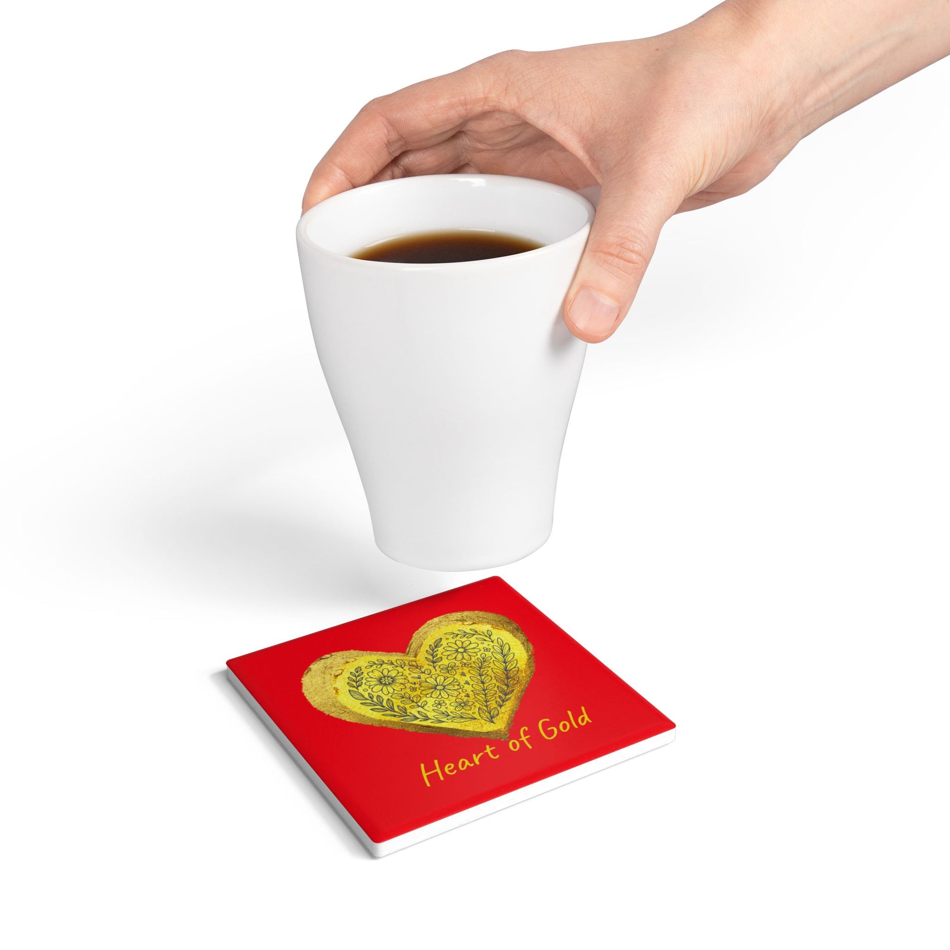 By Canyon 17, creations that inspire the mind and soul. Add warmth and style to any space with this red ceramic coaster featuring our radiant and soulful "Heart of Gold" design. With a non-slip cork backing and easy-to-clean surface, it's perfect for hot or cold drinks. Available in round or square.