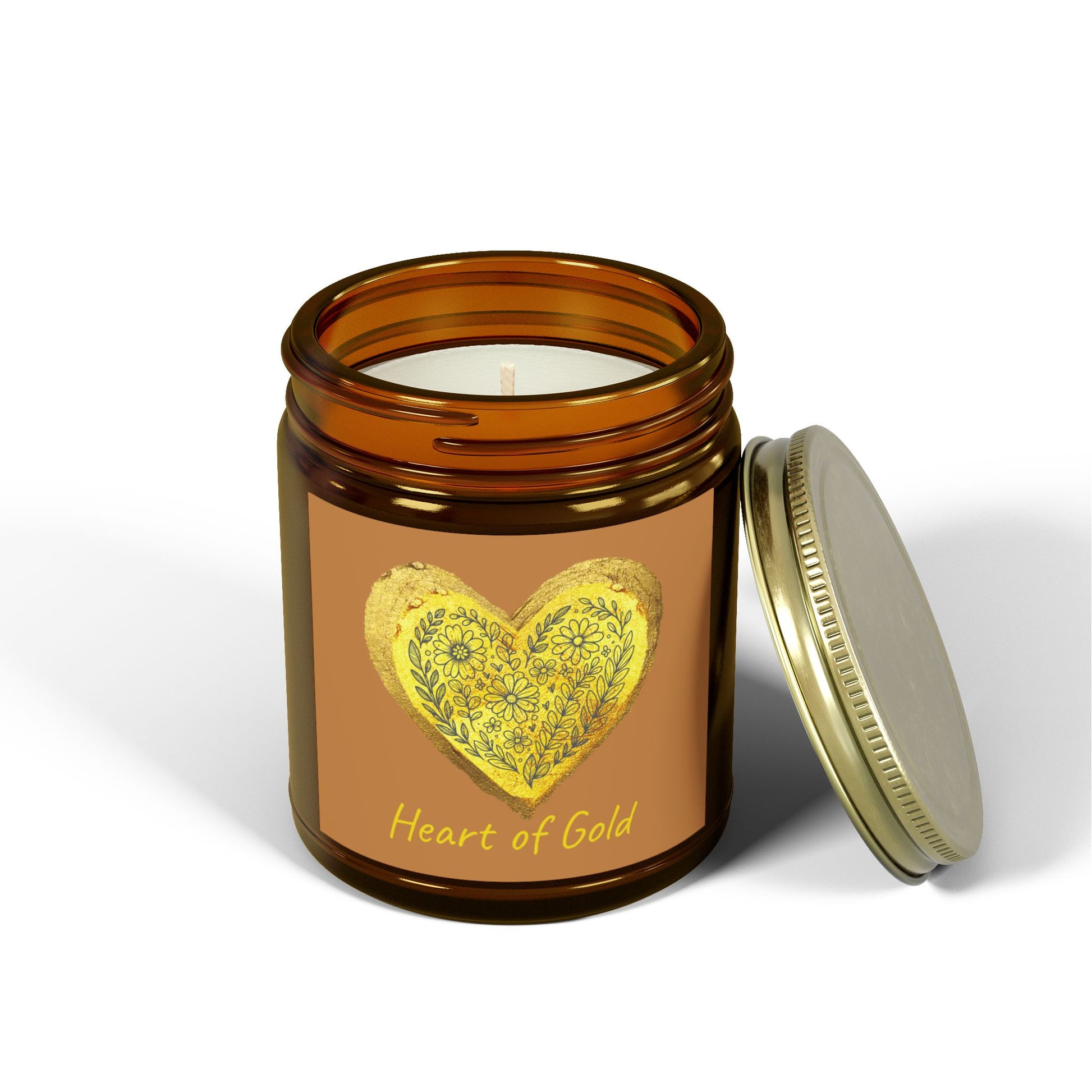 By Canyon 17, creations that inspire the mind and soul. Infuse your space with warmth and meaning with this beautifully crafted candle featuring our radiant "Heart of Gold" design, set against a brown background that adds a vibrant touch. Hand-poured in the USA from premium coconut apricot wax and finished with lead and zinc-free cotton wicks, they offer a clean, even burn and a rich aromatic experience. Choose from nine inviting scents, poured into elegant amber or clear glass vessels and topped with a stylish gold lid - perfect for adding ambient beauty to any home.