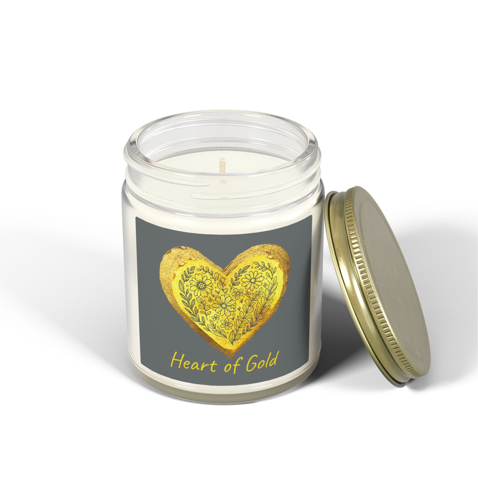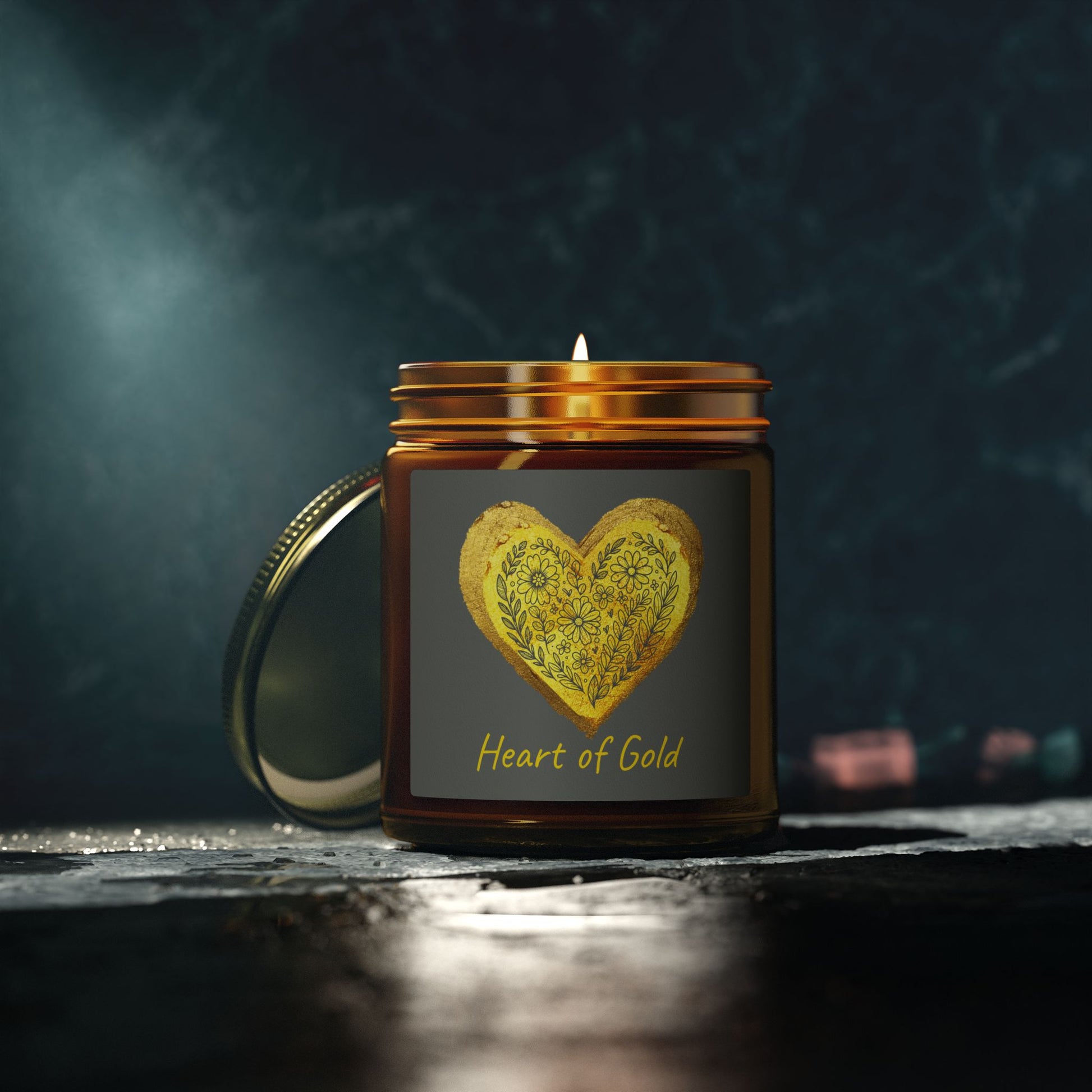 By Canyon 17, creations that inspire the mind and soul. Infuse your space with warmth and meaning with this beautifully crafted candle featuring our radiant "Heart of Gold" design, set against a gray background that adds a vibrant touch. Hand-poured in the USA from premium coconut apricot wax and finished with lead and zinc-free cotton wicks, they offer a clean, even burn and a rich aromatic experience. Choose from nine inviting scents, poured into elegant amber or clear glass vessels and topped with a stylish gold lid - perfect for adding ambient beauty to any home.